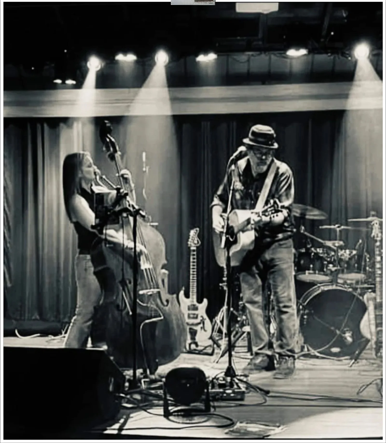 Wagon Roots is an acoustic duo from Door County. It is primarily a vehicle for original music and art. Mike Bleck wrote the majority of the repertoire at the Holiday Music Motel with his Steel Bridge songwriting family and his music can often be heard on steelbridgeradio.com Jen added upright bass, vocal harmonies, and her original acrylic paintings as poster art when helping Mike form the band in 2023. A collection of her paintings can be seen at most Wagon Roots shows or on their website: wagonroots.com